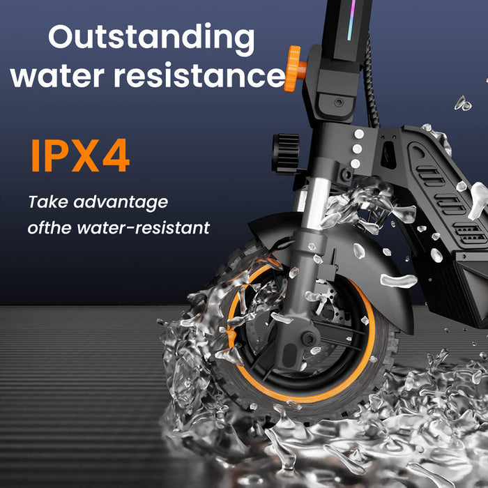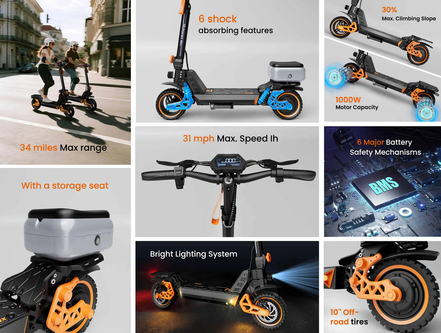 Monopattino elettrico con motore da 1000 W, velocità massima 31 mph (50 km/h), autonomia fino a 34 miglia (55 km), 3 modalità di velocità, sistema di sospensione a 6 ammortizzatori, pneumatici fuoristrada da 10”, struttura pieghevole ideale per il trasporto e i viaggi.