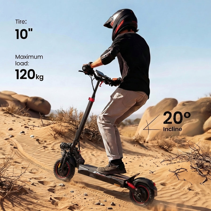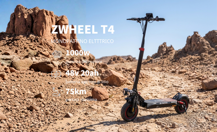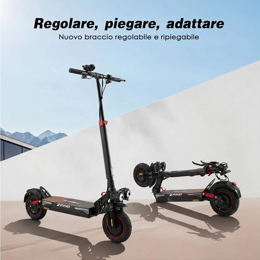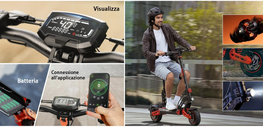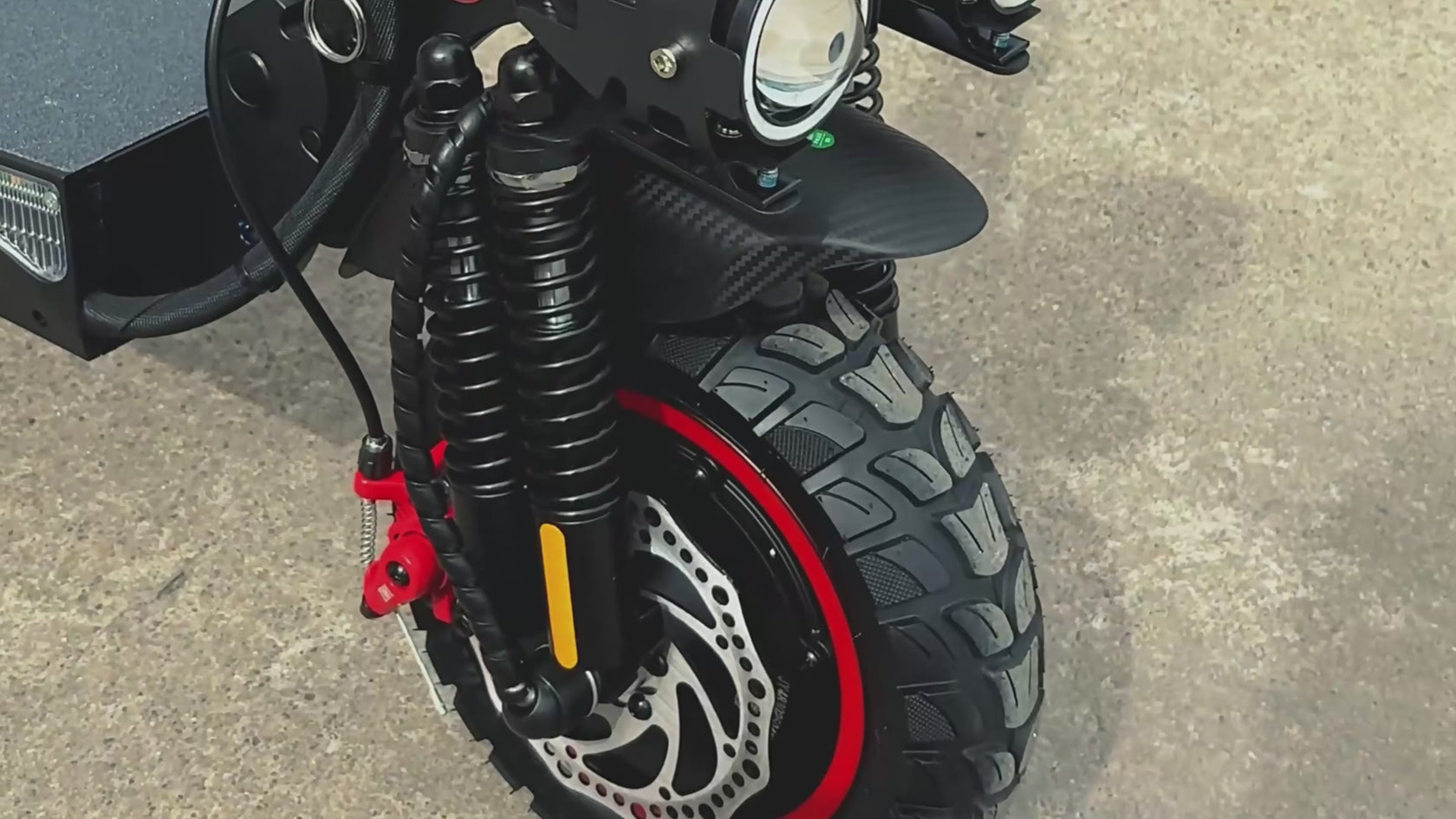 Monopattino elettrico con motore da 1000 W, pneumatici fuoristrada da 10”, struttura ideale per uso urbano e off-road. Dotato di freni a disco idraulici, batteria 48V 20Ah.
